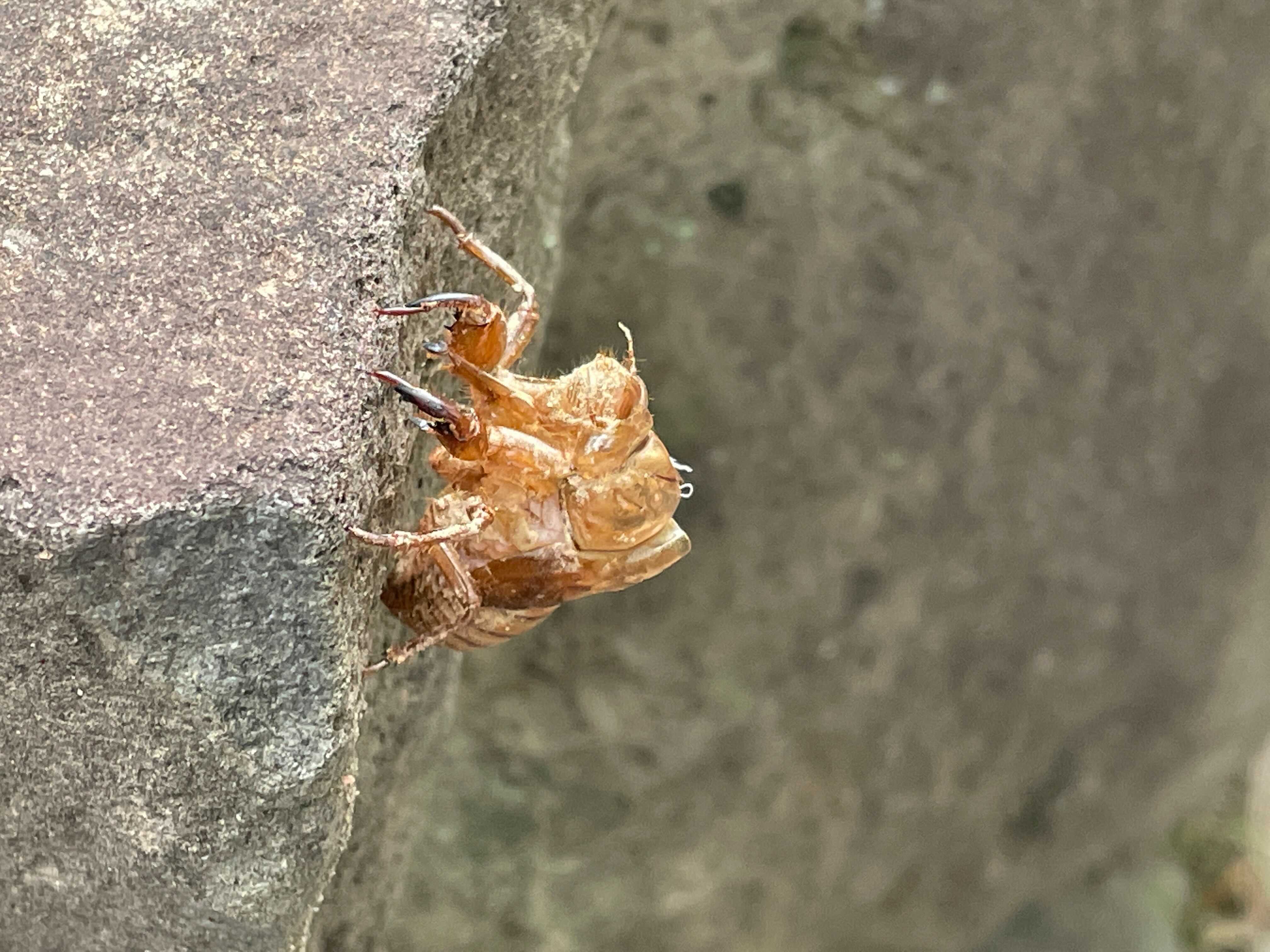 上の写真は緑道の脇、石垣に見つけた抜け殻です。