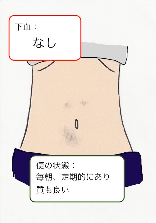 初診後、下痢は落ち着きやや軟便に。また便回数も朝・昼の2回になり、出血は今までより少なくなる。