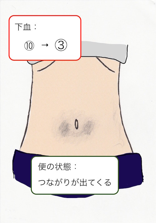 3診目後、下痢はなくやや軟便。便回数は2回で、出血はなし。