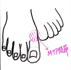 急性の単関節炎が起こり、特に第一趾MTP関節に起こりやすい。