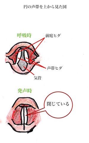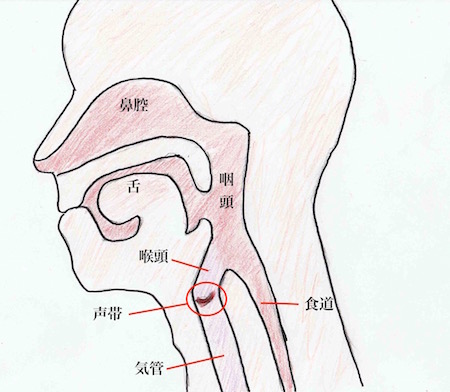 喉頭(こうとう:のどと気管の間)にある声帯(せいたい)を