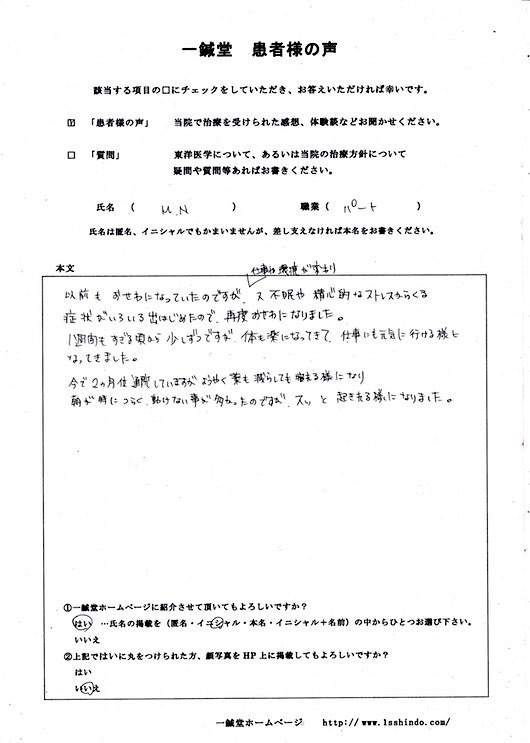 以前もおせわになっていたのですが、 仕事や環境が変わり、 又 不眠や精神的なストレスからくる 症状がいろいろ出はじめたので、 再度おせわになりました。 1週間もすぎる頃から少しずつですが、 体も楽になってきて、 仕事にも元気に行ける様になってきました。 今で2ヶ月位通院していますが ようやく薬も減らしても寝れる様になり 朝が特につらく動けない事が多かったのですが スッと起きれる様になりました。