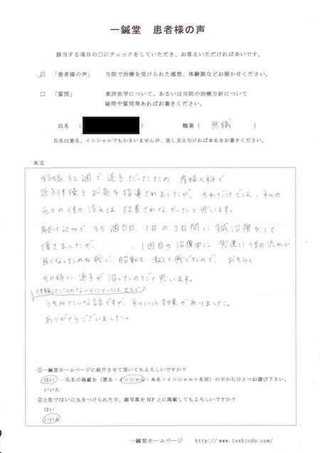 駆け込みで35週0日、1日の2日間に鍼治療をして頂きましたが、 1回目の治療中に急速に体の流れが良くなったのを感じ、 胎動も激しく感じたので、 おそらくその時に逆子が治ったのだと思います。 体験したことのない人にとってはまるで うそみたいな話ですが、私には効果がありました。 ありがとうございました。