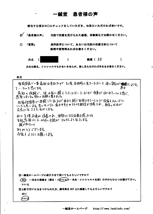 双極性障害で休職していましたが 疲れを鍼で回復させていくことで 復帰もスムーズにいったと思います。 昔に比べると疲れやすさやストレス耐性が改善され、 身体の土台が丈夫になってきた気がします。 他に生理不順が改善され、便秘になる回数も減ったりと 当初鍼で治したいと意図していた以外の不調が どんどんよくなっています。