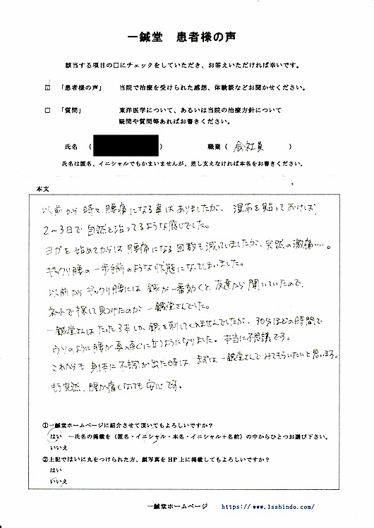 【体験談】 以前から時々腰痛になる事はありましたが、 湿布を貼っておけば、2~3日で自然と治ってるような感じでした。 ヨガを始めてからは腰痛になる回数も減っていましたが、 突然の激痛・・・・。 ギックリ腰の一歩手前のような状態になってしまいました。 以前からギックリ腰には鍼が一番効くと友達から聞いていたので、 ネットで探して見つけたのが一鍼堂さんでした。