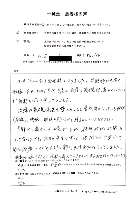 治療は基礎体温を整えることと 普段気になっている症状(肩凝り、便秘、睡眠不足)などを 緩和していただきました。