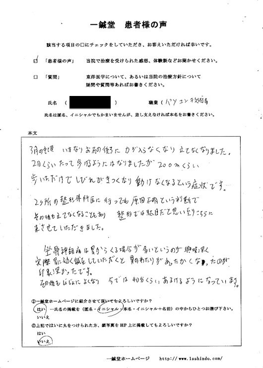 【体験談】 3月中頃いきなり お尻の後ろに力が入らなくなり立てなくなりました。 2日くらいたって歩ける様になりましたが、 200mくらい歩いただけでしびれがきつくなり 動けなくなるという症状です。 2ヶ所の整形外科医に行っても 原因不明という判断でその後も立てなくなることもあり 整形では駄目だと思い至り こちらに来させて頂きました。