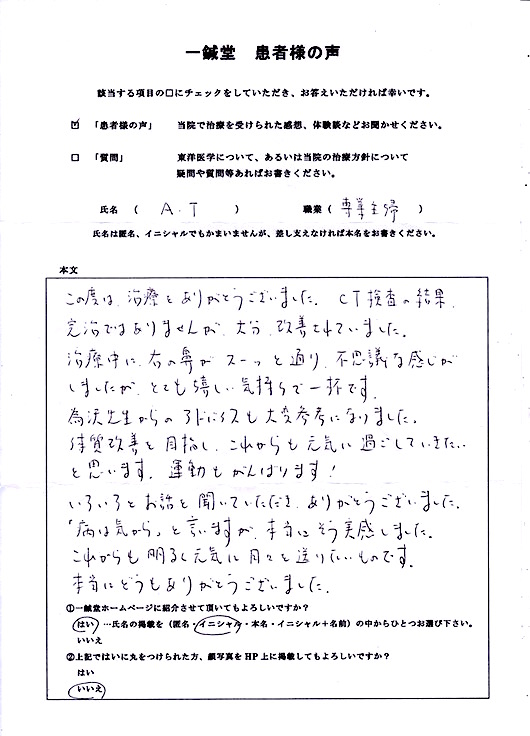 この度は治療ありがとうございました。 CT検査の結果、完治ではありませんが 大分改善されていました。 治療中に右の鼻がスーッと通り 不思議な感じがしましたが とても嬉しい気持ちで一杯です。 為沢先生からのアドバイスも大変参考になりました。 体質改善を目指し、 これからも元気に過ごしていきたいと思います。 運動もがんばります!