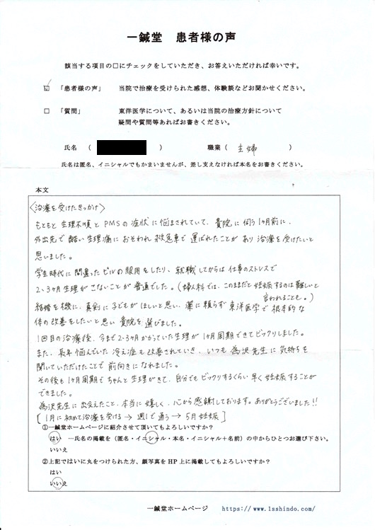 学生時代に間違ったピルの服用をしたり、 就職してからは仕事のストレスで2〜3ヶ月 生理がこないことが普通でした。 (婦人科では、このままだと 妊娠することは難しいと言われることも。) 結婚を機に、真剣に子どもがほしいと思い、 薬に頼らず東洋医学で根本的な体の改善をしたいと 思い貴院を選びました。