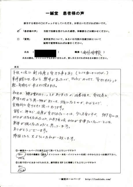 施術を重ねる毎に、御体の改善を実感されていた患者さまです。
