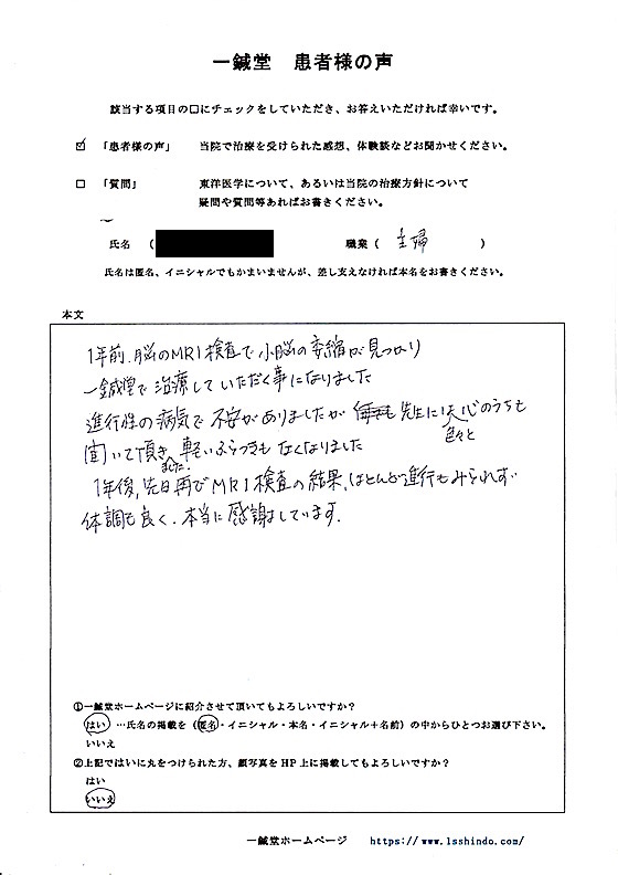 【体験談】 1年前、脳のMRI検査で小脳の萎縮が見つかり 一鍼堂で治療していいただく事になりました。 進行性の病気で不安がありましたが、先生には色々と心のうちを 聞いて頂きました。軽いふらつきもなくなりました。 1年後、先日再びMRIの検査の結果、ほとんど進行もみられず、 体調も良く、本当に感謝しています。