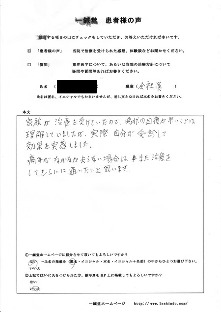 ------------------------------------------- 【体験談】 家族が治療を受けていたので、病状の回復が早いことは理解していましたが実際自分が受診して効果を実感しました。痛みがなかなか去らない場合は、また治療をしてもらいに通いたいと思います。 (本文ママ。) --------------------------------------------------