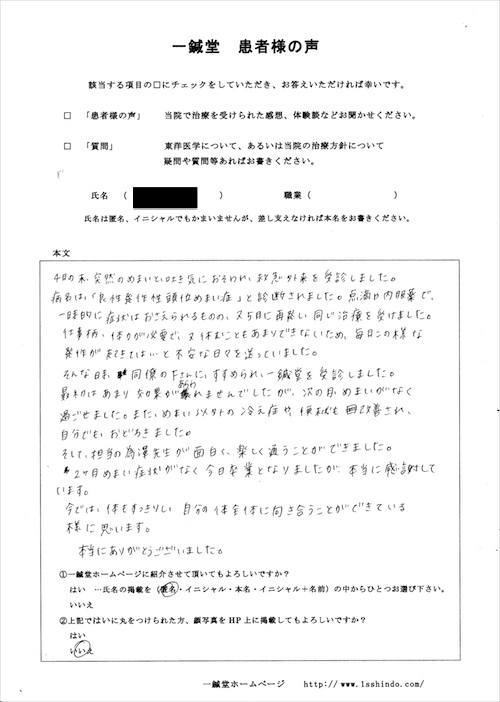 【体験談】 4月の末、 突然のめまいと吐き気におそわれ、 救急外来を受診しました。 病名は「良性発作性頭位めまい症」と診断されました。 点滴や内服薬で一時的に症状はおさえられたものの、 又5月に再発し、同じ治療を受けました。 仕事柄、体力が必要で、 又休むこともあまりできないため、 毎日この様な発作が起きては…と 不安な日々を送っていました。 そんな時、同僚のFさんにすすめられ、 一鍼堂を受診しました。