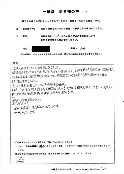 少しずつ体調が整うようになり、今年の夏に妊娠。 結婚して3年ほどの間、 子どものことで悩んでいたので 先生には相談にのっていただいていました。 特に病院での不妊治療や検査は受けていませんでした。 仕事のストレスや精神的なものだと思っていましたので、 経過は順調で、安定期に入ったところです。 ありがとうございます。