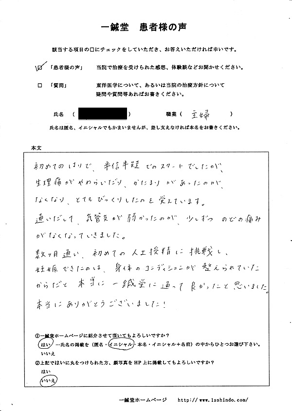 【担当鍼灸師(本多)より】 N.O様、ご懐妊おめでとうございます。保育士のお仕事が多忙の中でも、定期的にご来院頂いたことで、体質改善することができ、ご懐妊へ繋がったのだと思っております。
