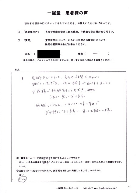 【体験談】 施術をしてもらって、自分の体質を細かく 調べていただき、体の調子が良くなりました。 お陰様で妊娠することができ、うれしく思っております。 妊娠してからも、いろいろとつわり等で お世話になります。宜しくお願いします。