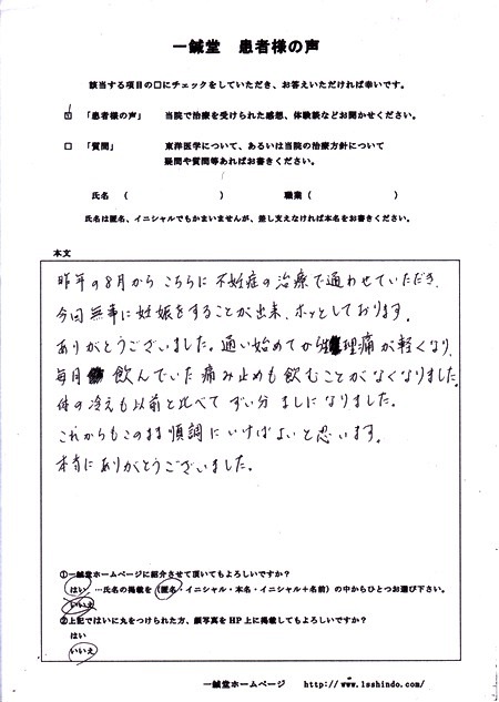 【体験談】 昨年の8月から こちらに不妊症の治療で通わせていただき 今回無事に妊娠をすることが出来、 ホッとしております。 ありがとうございました。 通い始めてから生理が軽くなり、 体の冷えも以前と比べてずい分ましになりました。 これからもこのまま順調にいけばよいと思います。 本当にありがとうございました。