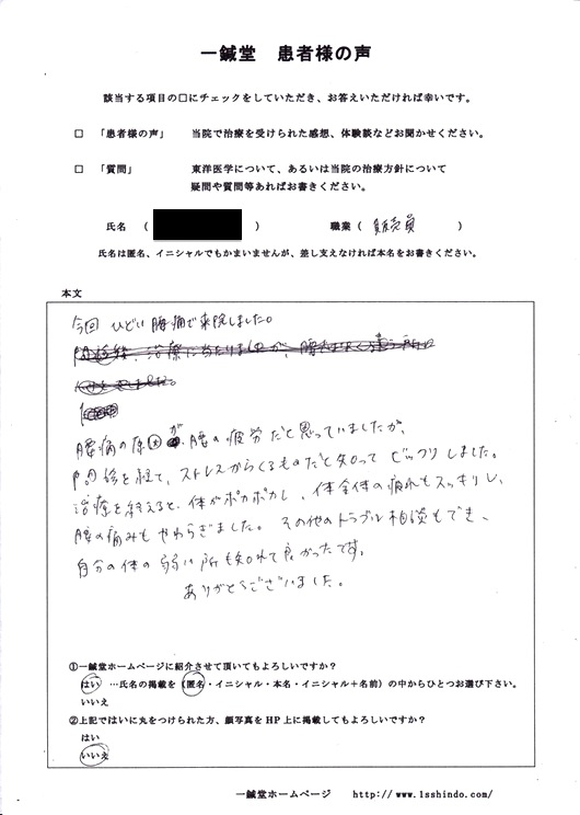 【体験談】 今回ひどい腰痛で来院しました。 腰痛の原因が腰の疲労だと思っていましたが 問診を経て、ストレスからくるものだと知って ビックリしました。 治療を終えると、体がポカポカし、 体全体の疲れもスッキリし、 腰の痛みもやわらぎました。 その他のトラブル相談もでき、 自分の体の弱い所も知れて良かったです。 ありがとうございました。