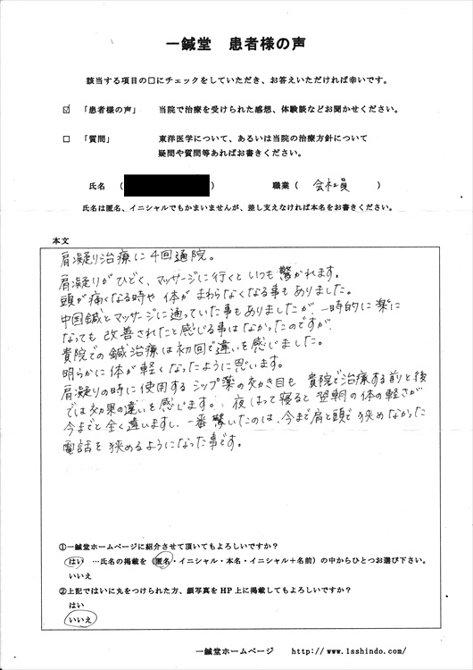 【体験談】 肩凝り治療に4回通院。 肩凝りがひどく、マッサージに行くといつも驚かれます。 頭が痛くなる時や体がまわらなくなること事もありました。 中国鍼とマッサージに通っていた事もありましたが、 一時的に楽になっても改善されたと感じる事はなかったのですが、 貴院での鍼治療は初回で違いを感じました。 明らかに体が軽くなったように思います。 肩凝りの時に使用するシップ薬の効き目も 貴院で治療する前と後では効果の違いを感じます。 夜はって寝ると翌朝の体の軽さが今までと全く違いますし、 一番驚いたのは、 今まで肩と頭で挟めなかった電話を挟めるようになった事です。