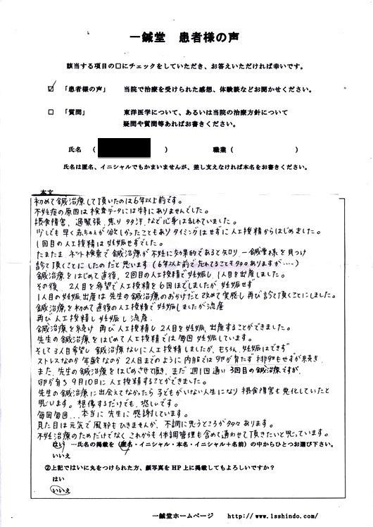 その後、2人目を希望で 人工授精を6回ほどしましたが妊娠せず。 1人目の妊娠、出産は先生の鍼治療のおかげだと 改めて実感し再び診て頂くことにしました。 鍼治療を初めて直後の人工授精で妊娠しましたが流産。 再び人工授精し妊娠し流産。 鍼治療を続け再び人工授精で妊娠し 2人目を妊娠、出産することができました。 先生の鍼治療をはじめて人工授精で毎回妊娠しています。