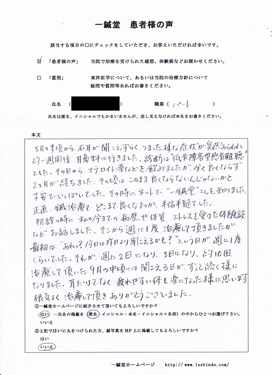 【体験談】 5月の末頃から、右耳が聞こえずらく、 つまった様な症状が突然あらわれ 約一週間後耳鼻科に行きました。 診断は〝低音障害型感音難聴〟でした。 その日から、ステロイド薬などを飲みましたが、 全く良くならず2ヶ月が経ちました。 その頃はこのまま良くならないんじゃないかと 不安でいっぱいでした。 その時にネットで〝一鍼堂〟さんを知りました。