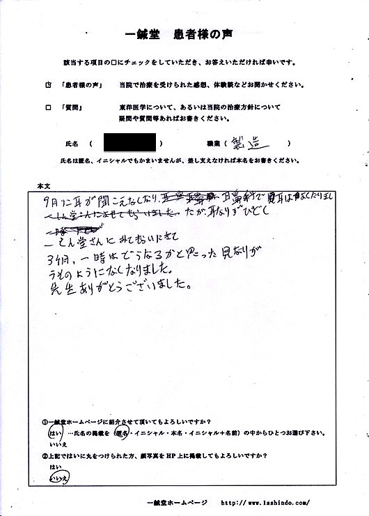 ------------------------------------------- 【体験談】 9月に耳が聞こえなくなり耳鼻科で耳はよくなりましたが、耳なりがひどく 一しん堂さんにみてもらいにきて3ヶ月、一時はどうなるかと思った耳なりがうそのようになくなりました。先生ありがとうございました。 (本文ママ。) --------------------------------------------------