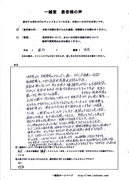 【依頼時の内容】 主訴: 不妊・肩こり・足の関節痛