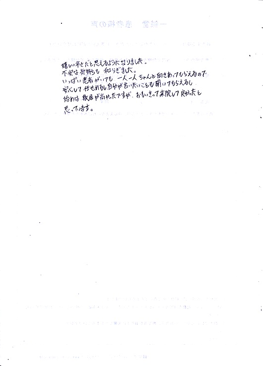 いっぱい患者がいても、 一人一人ちゃんと向き合ってもらえるので 安心して任せられるし、 自分が言いたいことも聞いてもらえるし、 始めは敷居が高かったですが おもいきって来院して良かったと思っています。