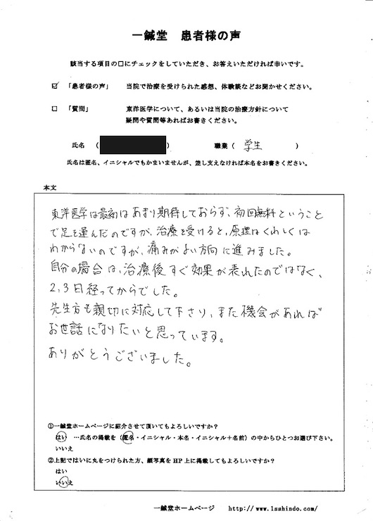 【体験談】 東洋医学は 最初はあまり期待しておらず、 初回無料ということで 足を運んだのですが、 治療を受けると、 原理はくわしくはわからないのですが、 痛みがよい方向に進みました。 自分の場合は、 治療後すぐ効果が表れたのではなく、 2、3日経ってからでした。 先生方も親切に対応して下さり、 また機会があれば お世話になりたいと思っています。 ありがとうございました。