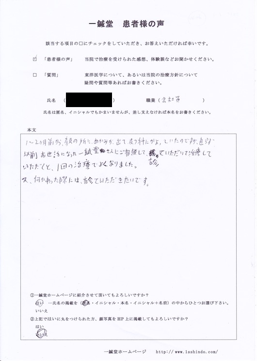 ------------------------------------------- 【体験談】 1~2ヶ月前から、顔の所にあかみが出て皮フ科にかよっていたのですが、直らず以前お世話になった一鍼堂さんにご相談して診ていただいて治療していただくと、1回の治療でよくなりました。又、何かあった際には、診ていただきたいです。 (本文ママ。) --------------------------------------------------