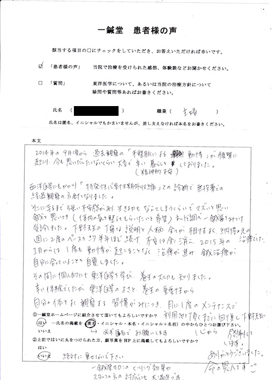 週に2度のペースを約半年ほど続け 不安は全く消え、 2015年の1月からは1度も 動悸が起こることなく治療が進み 鍼治療が自分に合っていることを 自覚しました。 その間に個人的にも 東洋医学を学び、 養生の大切も知りました。 辛い体験でしたが 東洋医学のよさと養生の重要性から 自分の体をよく観察する 習慣がみにつき、 月に1度のメンテナンスで 利用させて頂くまでに回復し、 下野先生に心から感謝しています。 ありがとうございました。 命の恩人です^_^