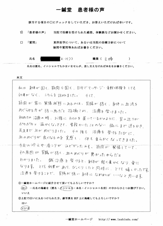 冷え性…大阪府豊能郡のK.H様の鍼灸治療体験談