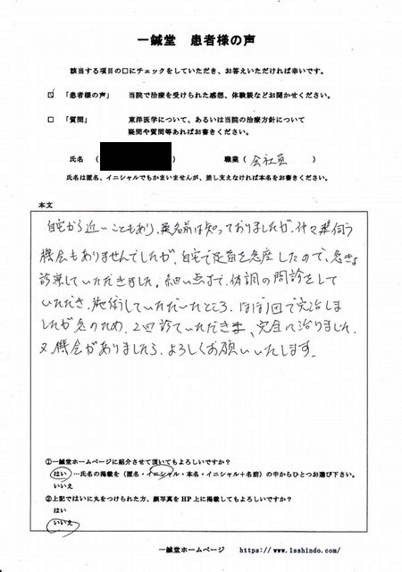 【体験談】 自宅から近いこともあり、名前は知っておりましたが、 なかなか伺う機会もありませんでしたが、 自宅で足首を捻挫したので急遽診療していただきました。 細かい点まで体調の問診をしていただき、施術していいただいたところ、ほぼ1回で完治しましたが 念のため2回診ていただき、完全に治りました。 また機会がありましたら、よろしくお願いいたします。