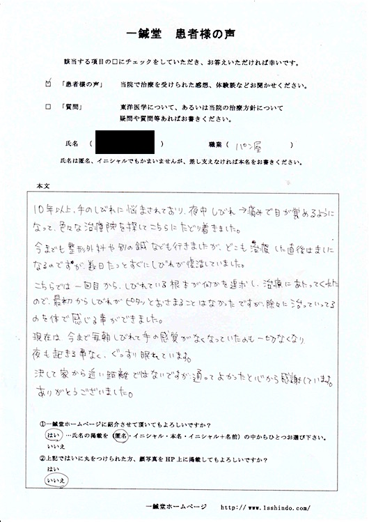 現在は今まで毎朝しびれて手の感覚がなくなっていたのも一切なくなり 夜も起きることなくぐっすり眠れています。 決して家から近い距離ではないですが、 通ってよかったと心から感謝しています。 ありがとうございました。