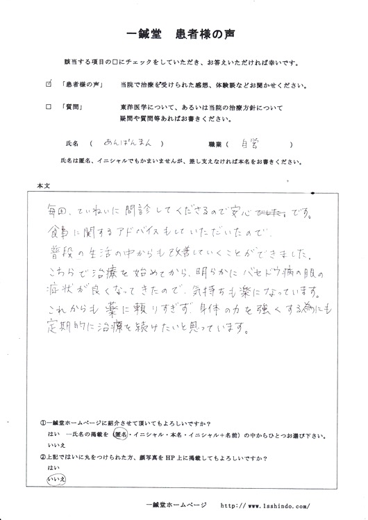 毎回、ていねいに問診してくださるので安心です。 食事に関するアドバイスもしていただいたので、 普段の生活の中から改善していくことができました。 こちらで治療を始めてから、 明きらかにバセドウ病の眼の症状が良くなってきたので、 気持ちも楽になっています。 これからも薬に頼りすぎず、 身体の力を強くする為にも定期的に治療を続けたいと思います。