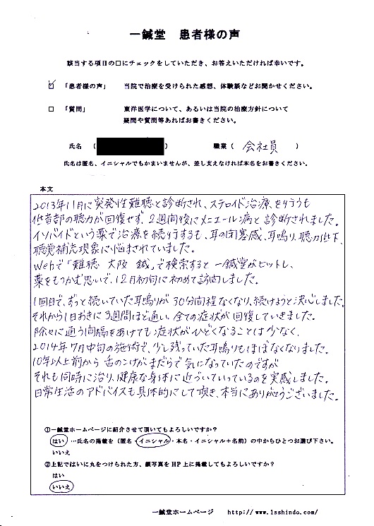 webで「難聴 大阪 鍼」で検索すると一鍼堂がヒットし、 藁をもつかむ思いで、12月初旬に初めて訪問しました。
