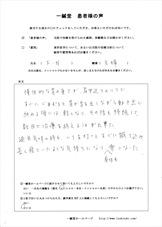 【体験談】 慢性的な胃の重さが、肩中辺りのハリで すぐにぐるぐると、胃が音を出しながら動き出し 終わる頃には、軽くなり、その後も持続して、 数回で治療を終えることが出来た。 過労気味の時も、ハリを打つとすぐに眠り込み、 長く寝ていたような気持ちになり身体も楽になった。
