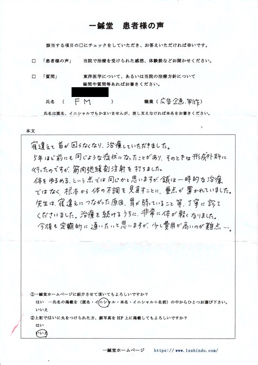 寝違えて首が回らなくなり、治療していただきました。 5年ほど前にも同じような症状になったことがあり、 そのときは形成外科に行ったのですが、 筋肉弛緩剤注射を打ちました。 体をゆるめるという点では同じかと思いますが、 鍼は一時的な治療ではなく、 根本から体の不調を見直すことに、 重点を置かれていました。 先生は寝違えにつながった原因、 胃が弱っていること等、丁寧に見てくださいました。 治療を続けるうちに非常に体が軽くなりました。 今後も定期的に通いたいと思いますが、 少し費用が高いのが難点…。