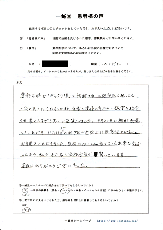 整形外科で「ギックリ腰」と診断され、 二週間以上経っても一向に良くならなかった時、 仕事の関係の方から一鍼堂を紹介され、 藁にもすがる思いで通院しました。 9月25日に初めて処置していただき、 11月11日までの計7回の通院で ほぼ完治との嬉しいお言葉をいただきました。 当初は10〜20m歩くことも出来なかったことから、 私だけでなく家族全員が驚いています。 本当にありがとうございました。