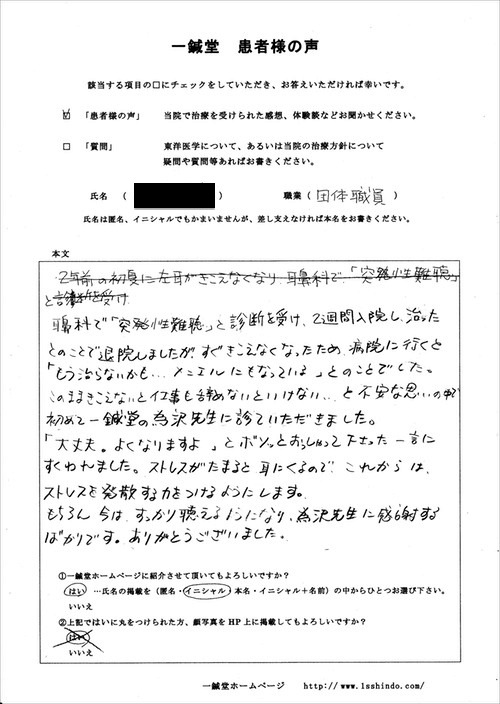 【体験談】 耳鼻科で「突発性難聴」と診断を受け、 2週間入院し、治ったとのことで退院しましたが、 すぐきこえなくなったため、病院に行くと 「もう治らないかも…メニエルになっている」とのことでした。 このままきこえないと仕事も辞めないといけない… と不安な思いの中で 初めて一鍼堂の為沢先生に診ていただきました。 「大丈夫。よくなりますよ」と ボソッとおっしゃって下さった一言にすくわれました。 ストレスがたまると耳にくるので、 これからは、ストレスを発散する力をつけるようにします。 もちろん今はすっかり聴こえるようになり、 為沢先生に感謝するばかりです。 ありがとうございます。