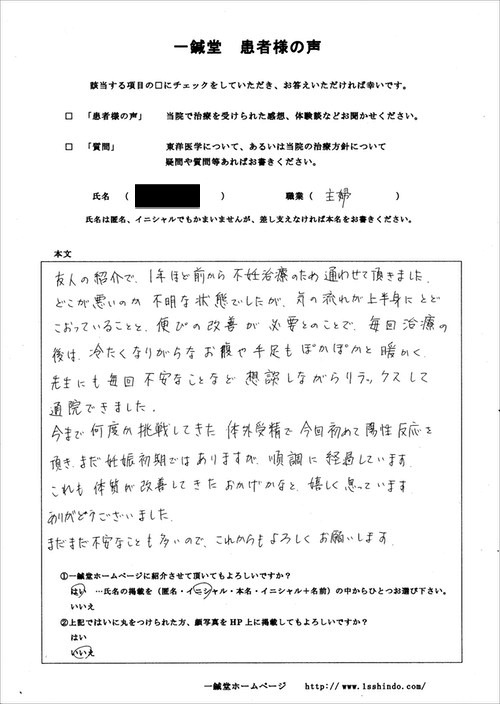 【体験談】 友人の紹介で、 1年ほど前から不妊治療のため通わせて頂きました。 どこが悪いのか不明な状態でしたが、 気の流れが上半身にとどこおっていることと、 便ぴの改善が必要とのことで、 毎回治療の後は冷たくなりがちなお腹や 手足もぽかぽかと暖かく 先生にも毎回不安なことなど相談しながら リラックスして通院できました。