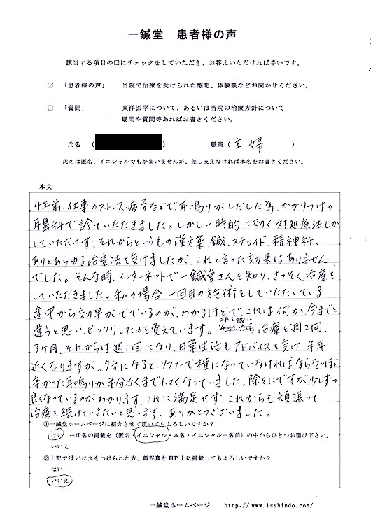 【体験談】 4年前、仕事のストレス、疲労などで、耳鳴りがしだした為、 かかりつけの耳鼻科で診ていただきました。 しかし一時的に効く対処療法しかしていただけず、 それからというもの漢方薬、鍼、ステロイド精神科、 ありとあらゆる治療法を受けましたが、 これと言った効果はありませんでした。 そんな時、インターネットで一鍼堂さんを知り、 さっそく治療をしていただきました。 私の場合、一回目の施術をしていただいている途中から 効果がでているのがわかるほどでこれは何か今までと違うと思い、 ビックリしたのを覚えています。 これを機に治療を週に2回、3ヶ月、 それからは週に1回になり、日常生活もアドバイスを受け、 半年近くになりますが、夕方になると、 ソファで横になっていなければならないほど 辛かった耳鳴りが半分近くまで小さくなっていました。徐々にですが、 少しずつ良くなっているのがわかります。これに満足せず、 これからも頑張って治療を続けていきたいと思います。 ありがとうございました。