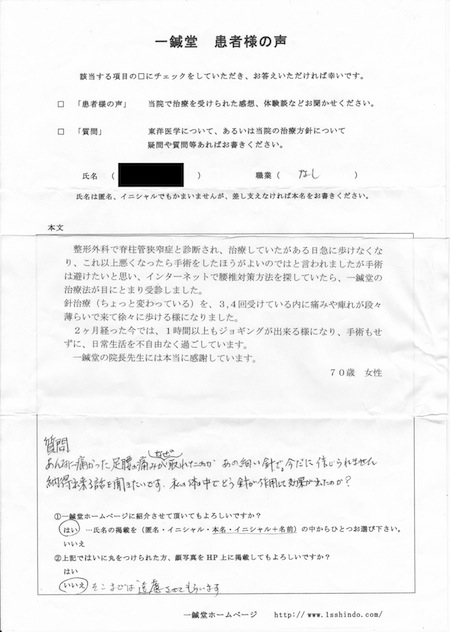 針治療(ちょっと変わっている)を 3、4回受けている内に痛みや痺れが段々薄らいで来て 徐々に歩ける様になりました。 2ヶ月経った今では、 1時間以上もジョギングが出来るようになり、 手術もせずに、日常生活を不自由なく過ごしています。 一鍼堂の院長先生には本当に感謝しています。