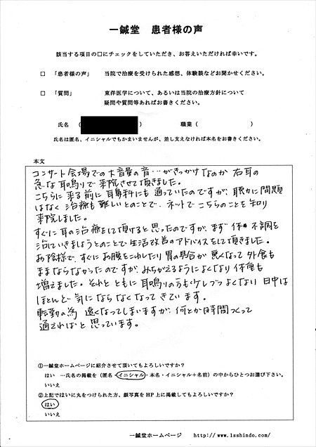 【体験談】 コンサート会場での大音量の音・・・がきっかけなのか 右耳の急な耳鳴りで来院させて頂きました。 こちらに来る前に耳鼻科にも通っていたのですが、 聴力に問題はなく治療も難しいとのことで、 ネットでこちらのことを知り来院しました。 すぐに耳の治療をして頂けると思ったのですが、 まず体の不調を治していきましょうとのことで 生活改善のアドバイスをして頂きました。 お陰様で、 すぐにお腹をこわしたり 胃の具合が悪くなって外食もままならなかったのですが、 みちがえるようによくなり体重も増えました。 それとともに耳鳴りの方も少しづつよくなり 日中はほとんど気にならなくなってきています。 転勤の為遠くなってしまいますが、 何とか時間つくって通えればと思っています。
