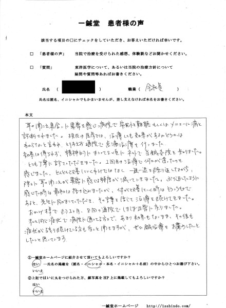 おかげ様で約1ヵ月、 8回の通院でほぼ正常に戻りました。 私と同じ症状で病院に通っている方々で、 あまり効果もないまま、 その後も症状が残り続けている方も多いと聞きますが、 ぜひ鍼治療をお薦めしたいと思っています。
