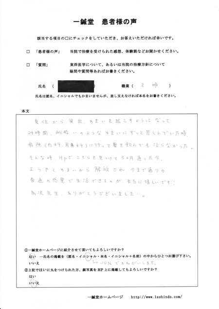”夏位から貧血、めまいを起こすようになって 24時間、船酔いのようなめまいにずっと苦しんでいた時、 病院(内科、耳鼻科)に行って薬を飲んでも治らなかった。 そんな時、HPでこちらを見つけて3ヵ月通った今、 ようやくめまいから解放され、今まで通りの普通の感覚で 生活できるのが本当に嬉しいです!! 為沢先生、ありがとうございました…。”