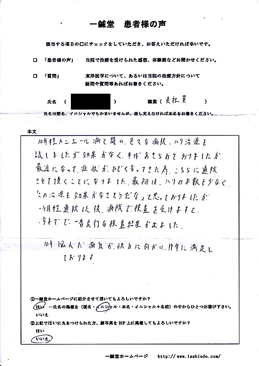 10年悩んだ病気が快方に向かい 非常に満足しております。
