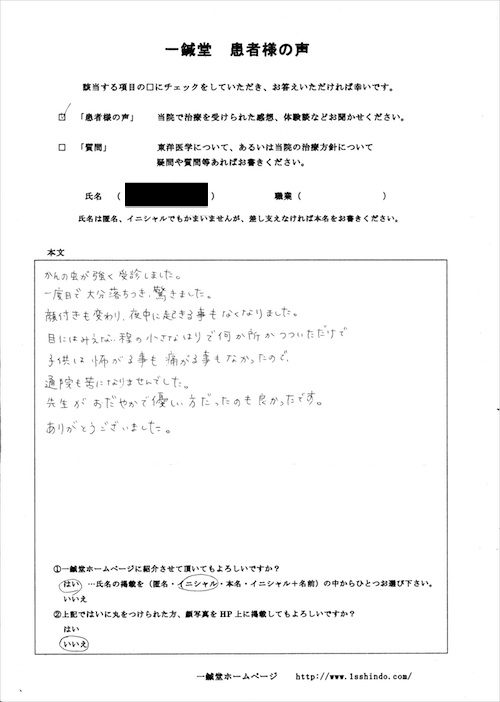 【体験談】 かんの虫が強く受診しました。 一度目で大分落ちつき、驚きました。 顔付きも変わり、夜中に起きる事もなくなりました。 目には見えない程の小さなはりで何か所かつついただけで 子供は怖がる事も痛がる事もなかったので、 通院も苦になりませんでした。 先生がおだやかな優しい方だったのも良かったです。 ありがとうございました。