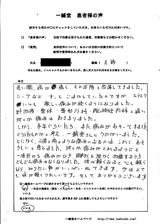 どうしたものかと考え、 一鍼堂さんにうかがいました。 とにかく、二度と前のような痛みになるのは こわく、おそろしいと感じました。 何とか痛みがとれるようにと 一度目から痛みがひき、間かくを短く治療するうち どんどん痛みはなくなりました。