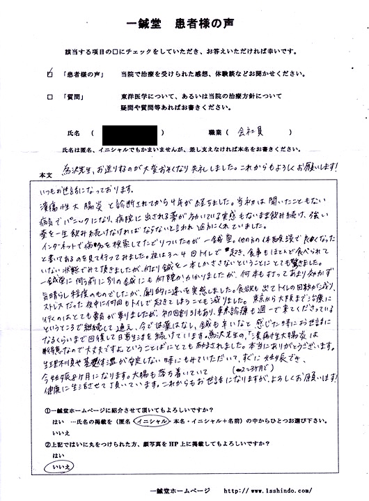 東京から大阪まで治療に行くのは とても勇気が要りましたが、初回割引もあり 東京診療も週一で来てくださっているということで 継続して通え、今では薬はなし、 鍼も辛いなと感じた時にお世話になるくらいまで 回復して日常生活を続けています。 為沢先生の「潰瘍性大腸炎は得意なので大丈夫ですよ」 ということばにとても励まされました。 本当にありがとうございます。